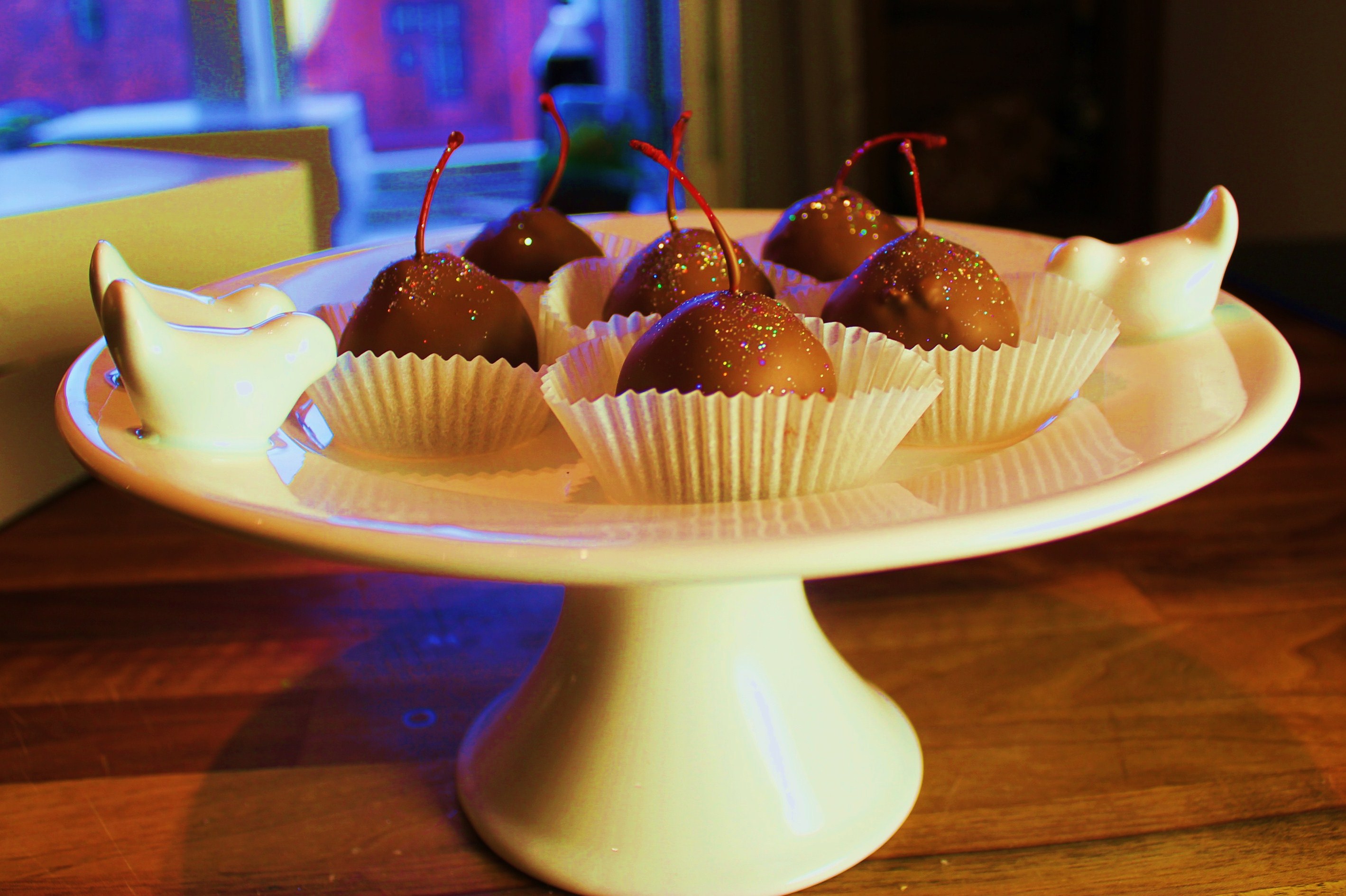 Mientras se pone en un tazon chocolate para derretir con una ch de manteca vegetal y se derrite hasta que quede liquido, se deja enfriar un poquito que este tibio y se sacan las cerezas y se cubren con el chocolate se detienen un poco ahi para quitar el exceso de chocolate y se colocan en un plato o capacillo para dejar secar y listo!