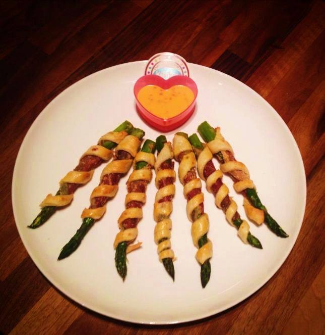 Primero hervir los esparragos unos 10 minutos, escurrirlos y dejarlos enfriar, mientras tanto, cortar las rebanadas de jamon serrano a la mitad y envolver cada esparrago (tratar de ponerlo en diagonal para que quede lo mas extendido posible en el esparrago ) en un plato mezclar una ch.chica de ajo en polvo, una pisca de sal y 2 ch soperas de polvo de queso parmesano y rodar los esparragos por esa mezcla para empanizarlos un poco, y despues cortar la masa de hojaldre en tiritas de menos de un cm de ancho, mojarlos con huevo y enrollarlos en diagonal tambien en los esparragos.. y acomodarlos en la charola y pasarles la brocha con el huevo tambien, y al horno a 180gr por 15 minutos o hasta que se vea doradita la masa..