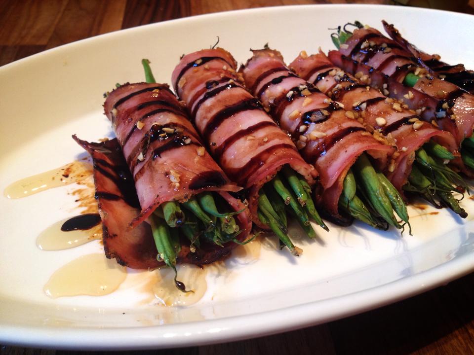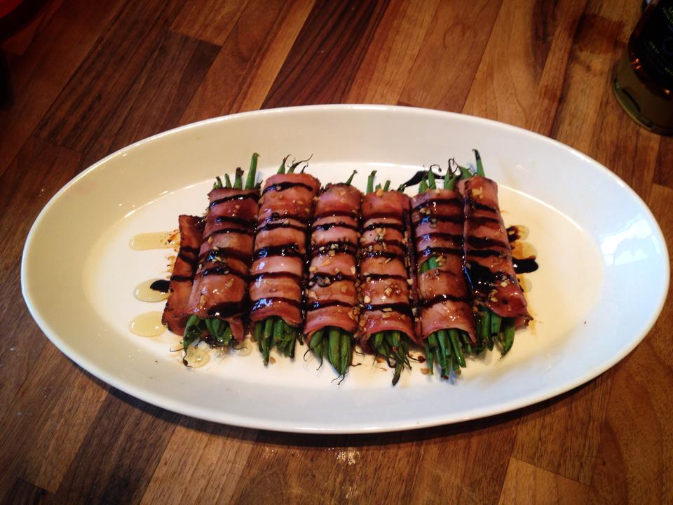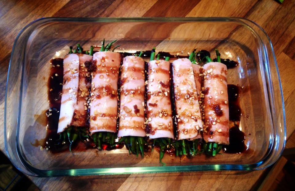 Se forman los atados con un puño de ejotes (así en crudo para que queden crujientes) y se enrollan y se ponen todos en fila, y encima se les baña de salsa de soya, ajo, un poquito de azucar mascabado o miel de agave.. y se hornean a 180 grados por 10 minutos y listos para servir!,