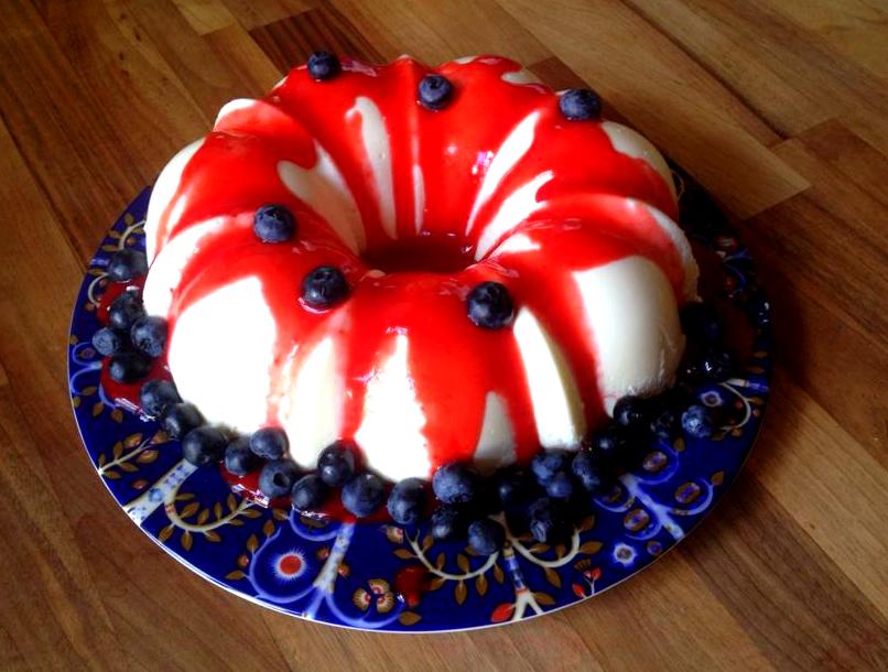 y ya lista la gelatina se desmolda con cuidado en un platon y se decora con la salsa de fresa y fresas o moras ya es cuestion de gustos