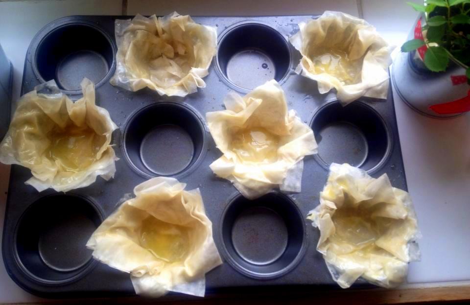 despues se desenrolla las hojas de la pasta y yo corte cuadrados como de 12 x 12 cm me salieron 3 a lo ancho.. y una vez teniendo los cuadros se les embarra mantequilla encima, y, se va poniendo uno por uno ( o a veces de dos en dos) hasta tener como 5 o 6 en los hoyos de la charola de cupcakes alternados para que queden diferentes formas de picos (como en la foto)