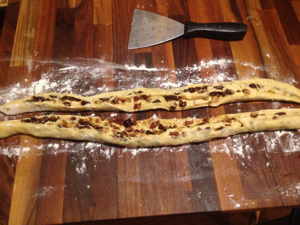 en su platon o charola ponen 6 panes 3 y 3 y luego yo puse uno partido a la mitad o sea dos lineas de 3 y ½ panes, y con una espatula embarre la primera tercera parte del jamón, cubri con pan, y puse la segunda capa del relleno al que le agregué el pimiento morrón, y cubri con pan, y otra vez la 3era y última capa de relleno y cubrí con el pan.