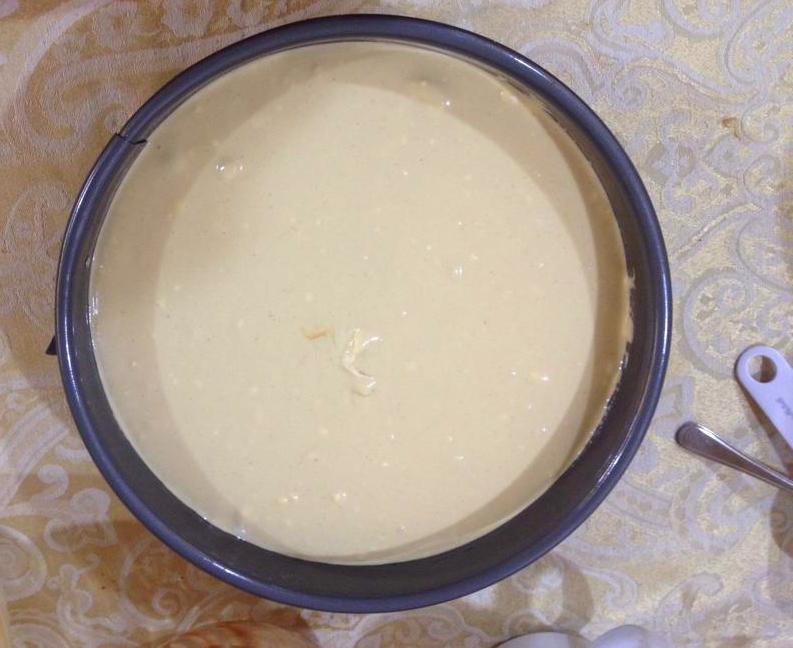 Grease, or spray with Pam, a 9 inch (23 cm) removable mold. Place the removable mold on a larger baking pan to catch any leakage while the cheesecake is baking. Preheat oven to 350 degrees F (180 degrees C) with rack in center of oven.