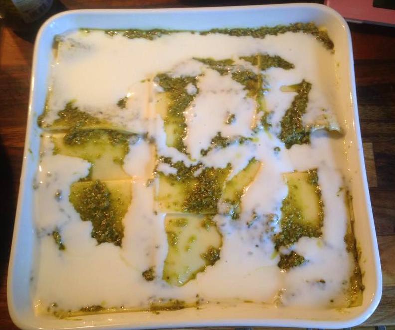 Después en un molde de 25 x 25cm (pero si no tienen usen el que tengan) le ponen primero un poco de spray o aceite en el fondo, y la primera capa de calabazas en lajas y una cucharada de las hojuelas de papa encima (esto es para que absorva un poco el liquido que soltarán)