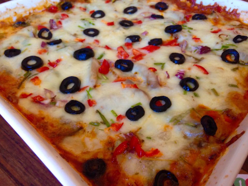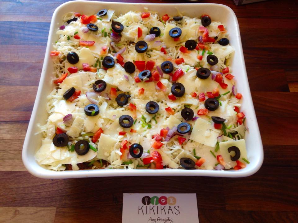 y quesos.. Tercera capa de calabazas, hojuelas de papa, salsa con la carne, quesos y ya ahi le puse los 200 gramos de queso mozarella fresco (pero como les digo, si uds no lo consiguen pues usen el que mas les guste) y otro poquito de lo que me sobro de parmesano y manchego rallado y decore con cuadritos de cebolla morada,cebollin, pimiento rojo y aceitunas negras